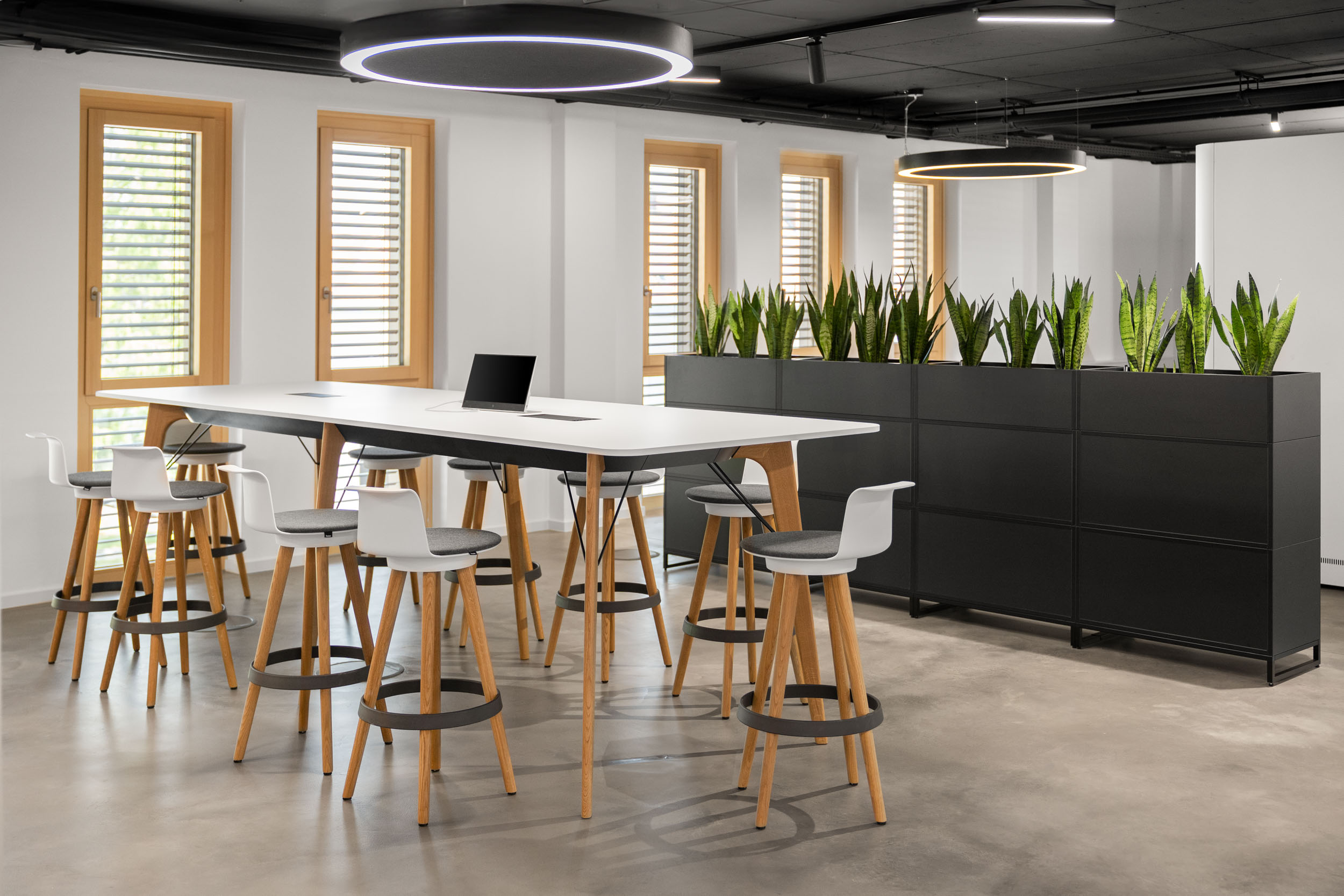 Jede Zone ist mit modernster Kommunikationstechnik ausgestattet. Der Co-Working-Space dient den einzelnen Teams der Bank als spontaner Treffpunkt und abteilungsübergreifende Kommunikationszone. Externe Mitarbeiter können diesen Bereich ebenfalls nutzen.